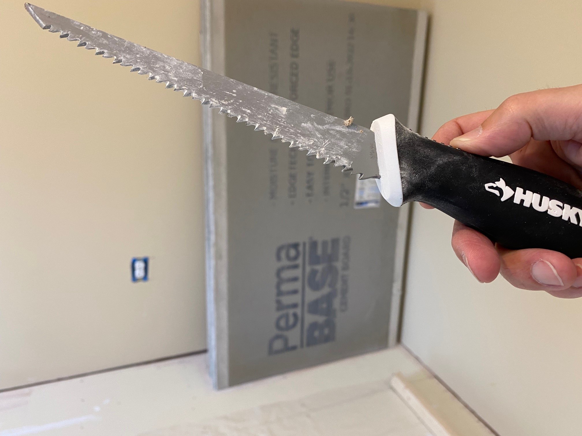 2) A new key hole saw and a sharp razor knife will be your best friends when working with these boards. You ‘score and snap’ (with the razor knife, a long metal straight edge, and your knee) and you leverage that keyhole saw for notches and cuts like the circular hole for the toilet flange. These are all very low cost items, and I just added Amazon links for each of them – so be sure to buy high-quality; it’s well-worth the few extra dollars to make your life easier.